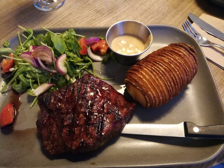 So onto the mains. We all ended up having the steak. It was a 10oz flat iron steak. I’ve never had a flat iron steak before but it was very nice. I asked them to cook it medium as I don’t like mine bloody! You can choose your preferred potato side… There were fries or a hassleback potato. Hassleback potato is where there are slices in the potato (not all the way through) and when it cooks the slits open up! I chose the hassleback potato. It was cooked nicely with the perfect crunch.