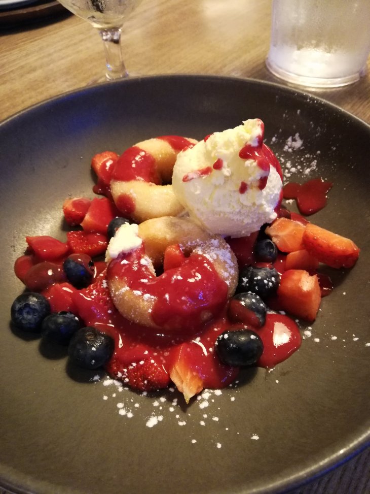 So for dessert I had Doughnut. Yes, it is what it says it is… It was sugared doughnuts with warm raspberries, strawberries and blueberries with vanilla ice cream. I love doughnuts and all the fruity bits. It wasn’t very sweet and I even had 3 of my 5 a day! The doughnuts were soft and paired with the fruit and coulis, I was in heaven. I didn’t want that dessert to end.