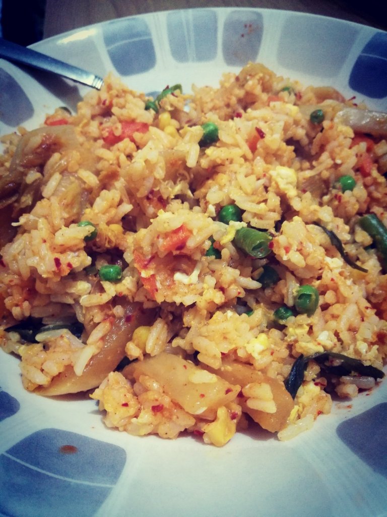 You start off frying off garlic and once that’s golden add in your Kimchi. Once that’s cooked off a bit, add in your frozen vegetables. You then add in your cold rice and just mix it all together. Push the rice to the side and add an egg (or 2), break up the egg and when it’s just about cooked push the rice into the egg and mix. Season if needed and serve. Simples!