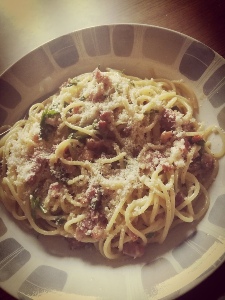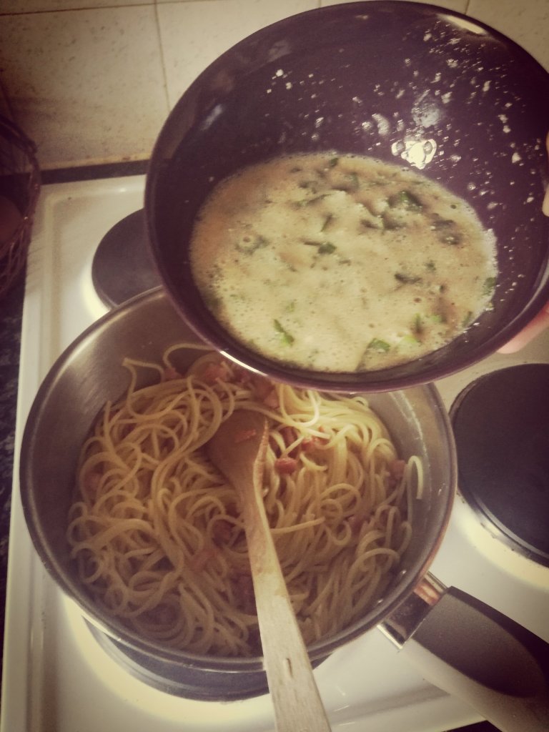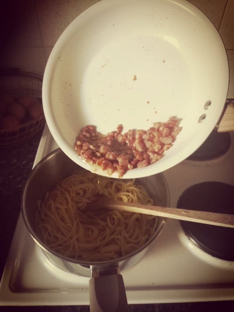 Add butter and oil into a frying pan and once the butter has melted, add in the pancetta/bacon and get it nice and crispy. Whilst you’re leaving the pancetta/bacon to crisp up, in a bowl crack in 4 eggs and add parmesan, parsley and pepper. Then mix together. Once the pasta is cooked, drain and add the crispy pancetta/bacon into the pasta. Then add the egg and cheese mixture and mix with the wooden spoon. The hot pasta will cook the egg mixture and turn it into a sauce. You can add salt and pepper to tasteBuon appetito!