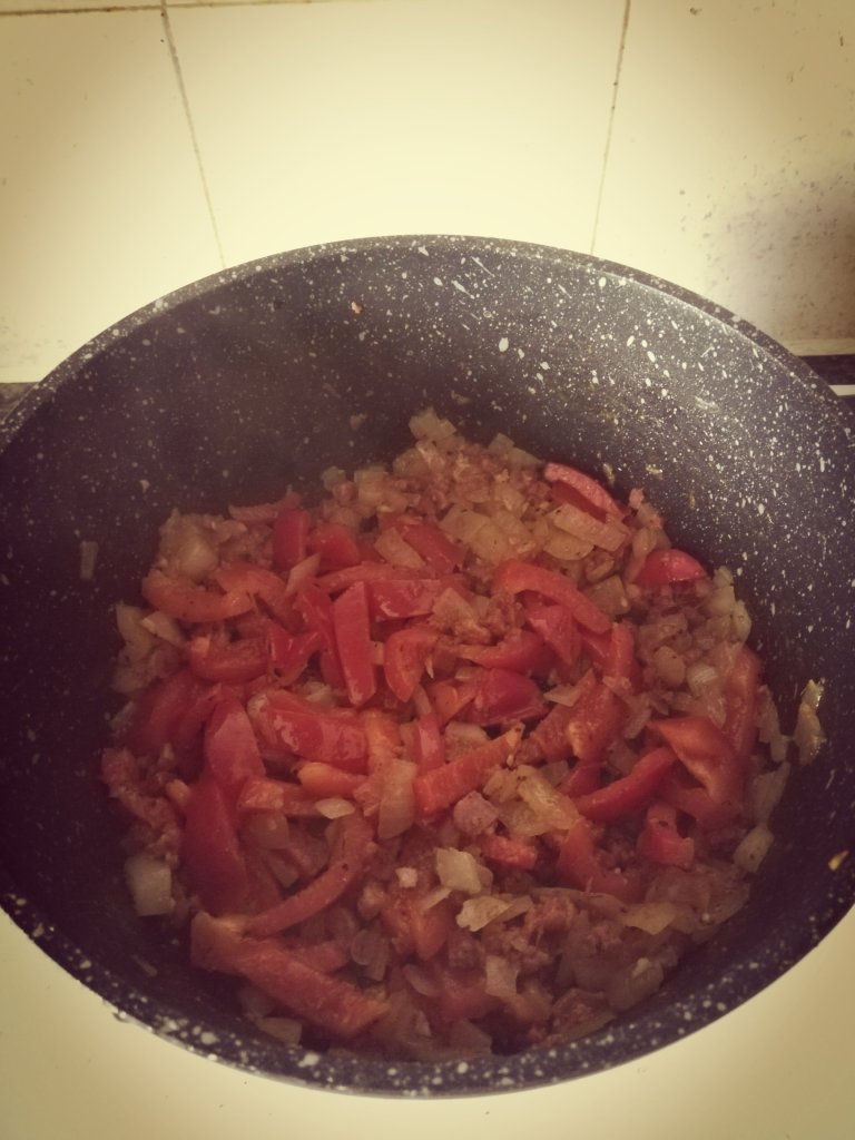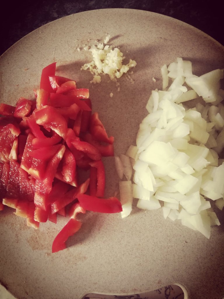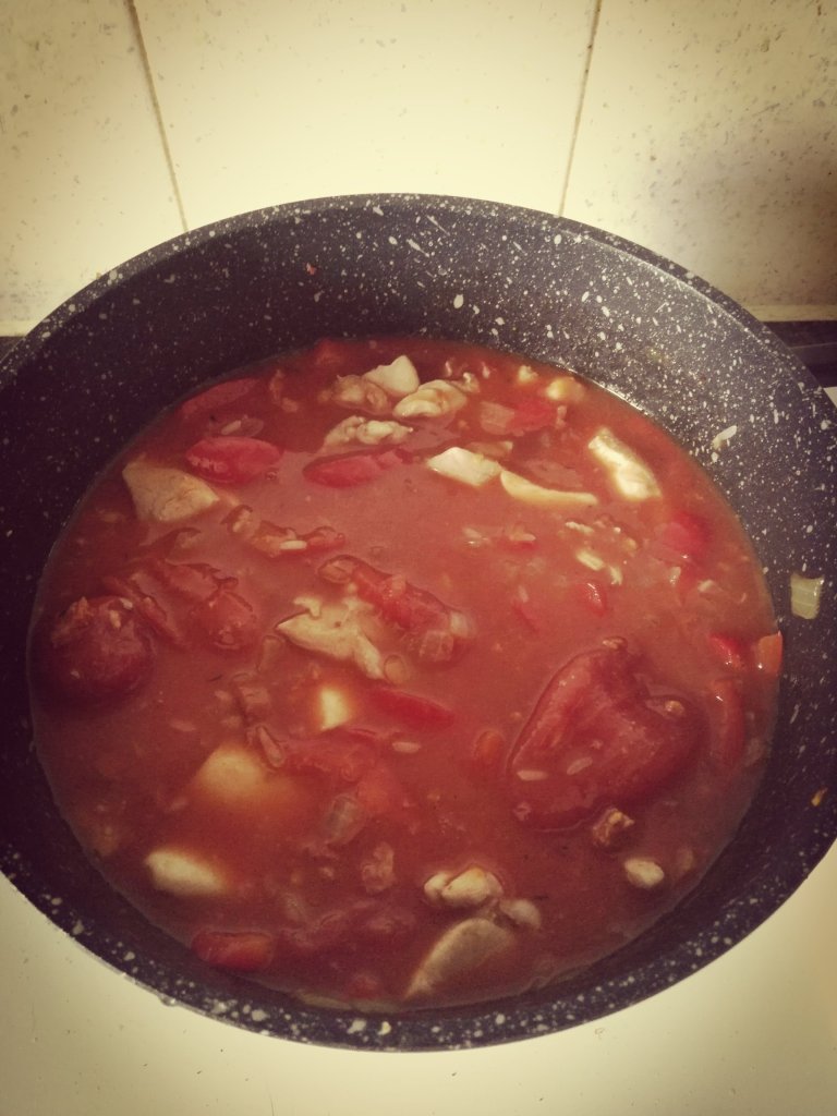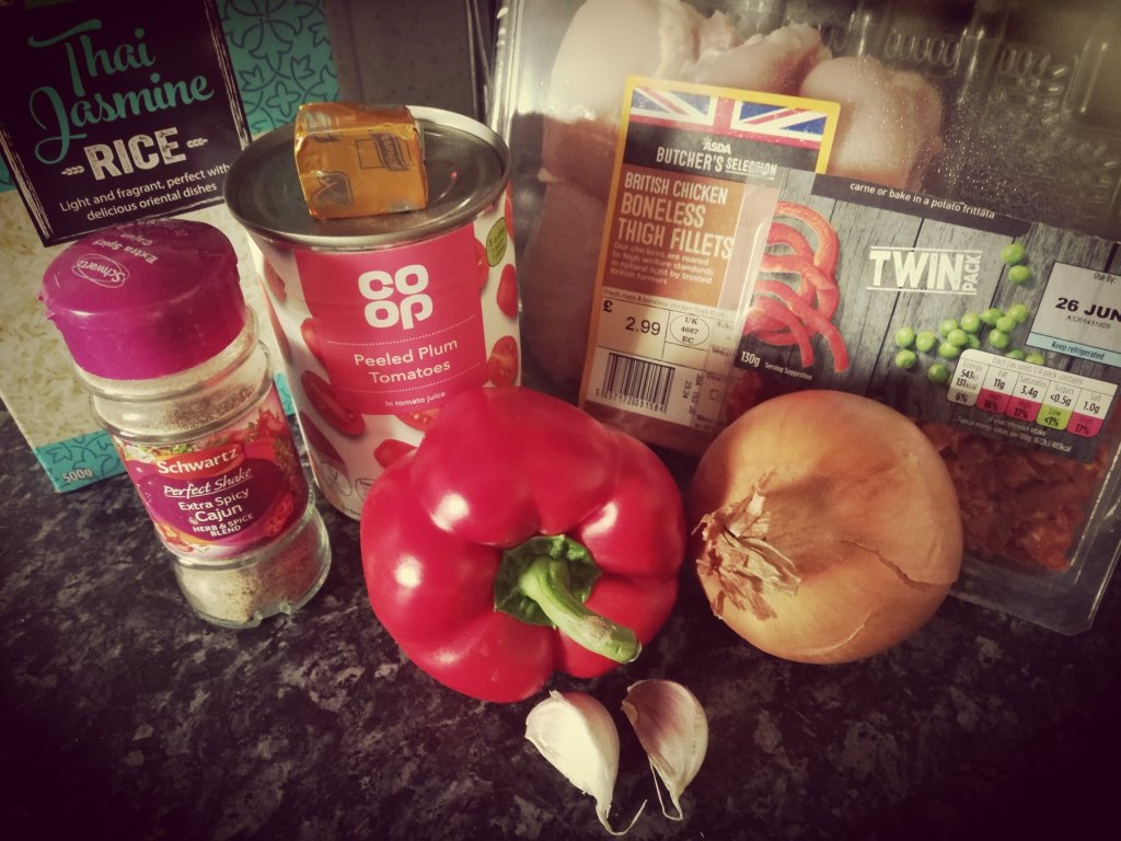 Ingredients are: chicken thighs (I used about 4 from that pack), Chorizo, 1 onion, 1 red pepper, 2 garlic cloves, 1 tablespoon cajun seasoning, 250g long grain rice, 400g canned plum tomatoes and 350ml chicken stockDice your onion, slice your red pepper and mince your garlicHeat oil and brown your chicken. Once browned take it out of the pan. Next, cook the onions until softened then add the red pepper, garlic, Chorizo and cajun seasoning. Cook all of this for about 5 minutes. After about 5 minutes, put the chicken back in the pan along with the rice, tomatoes and the chicken stock. Give it a stir and cover. Simmer for about 20-25 minutes or until the rice is tender. Ta da… Jambalaya!