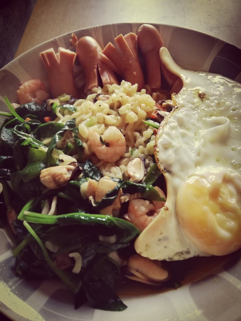 I had it with spicy jin ramen noodles, seafood, spinach and a fried egg. I cooked the egg a bit too much though