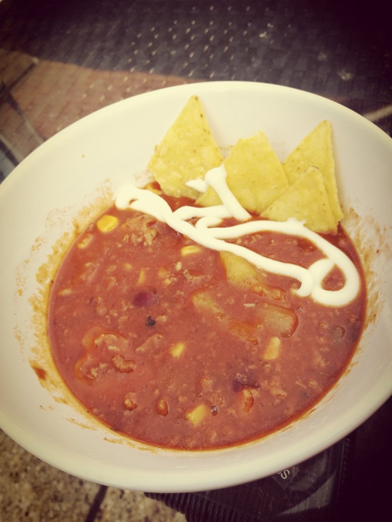 My friend John made some chilli and he asked me to try abit. He’s also put some Trinidad Scorpion chilli sauce on it to make it spicy for me.