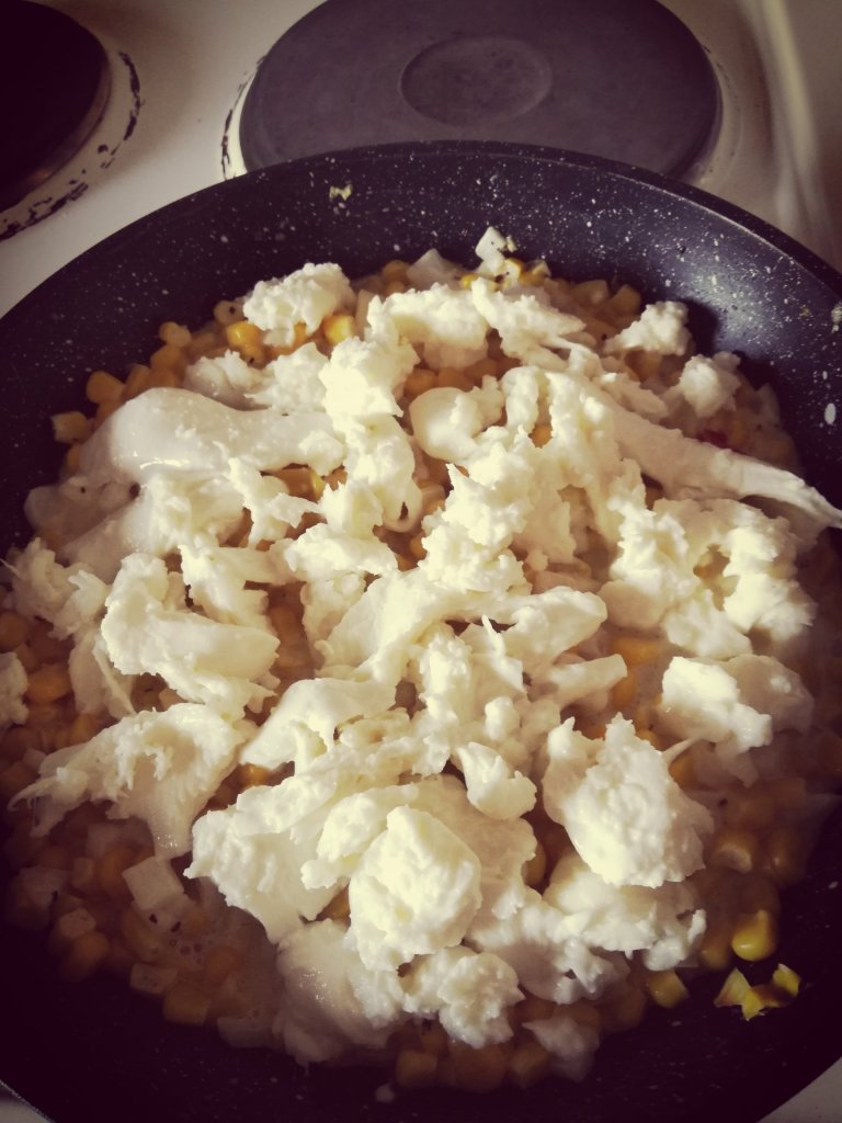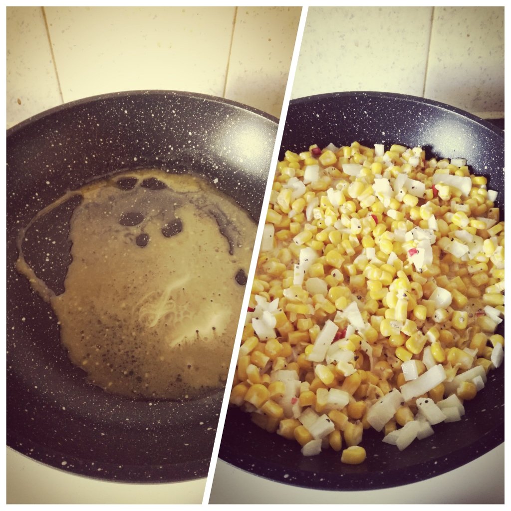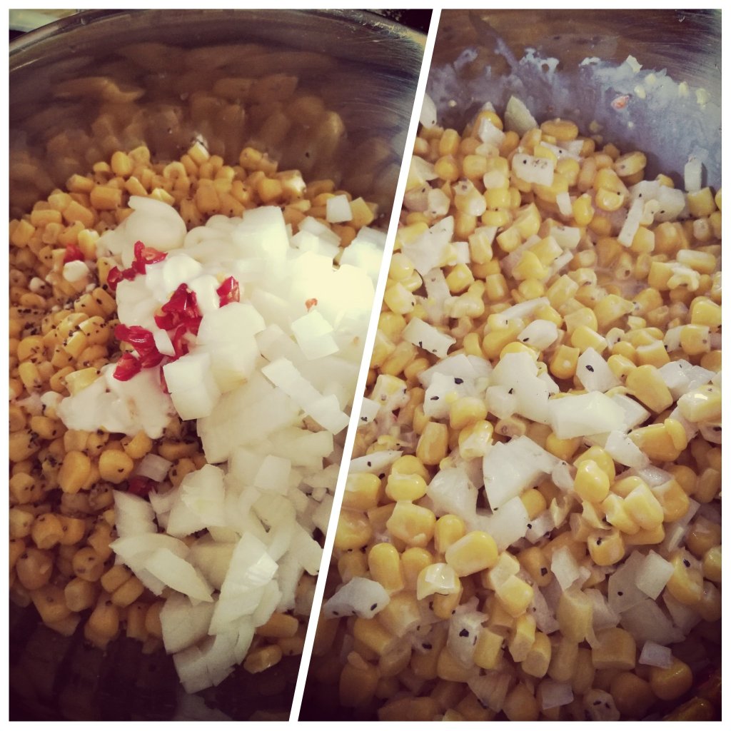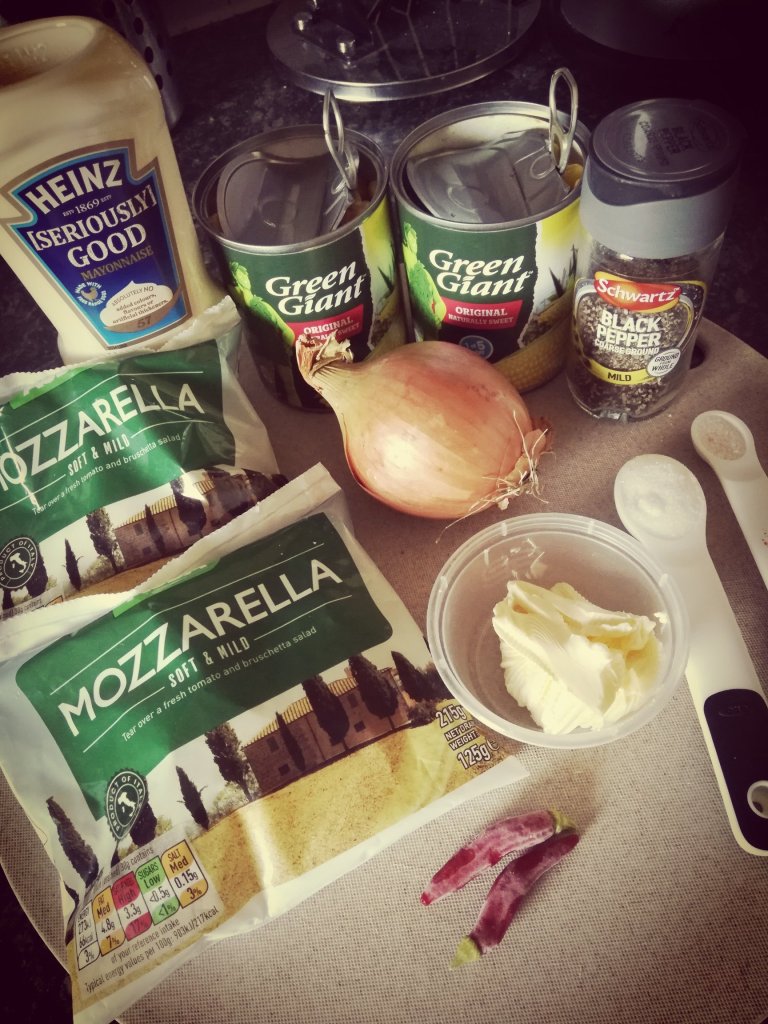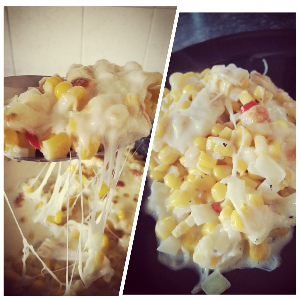 Ingredients (from her recipe): 15oz canned corn (drained), 3 tablespoon mayonnaise, 1 teaspoon sugar, quarter teaspoon salt, pinch of black pepper, medium size onion (chopped), 1 red chilli (finely chopped), half cup mozzarella and unsalted butter Combine the sweetcorn, mayonnaise, sugar, salt, black pepper, onion and chilli in a bowl Put the unsalted butter in a pan and once melted add in the corn mixOnce warmed through, shred your mozzarella and add it to the top of your corn mix. Ensure you flatten out the corn mixPlace it in the oven until golden brownIt is ready to eat! Look at the stringy mozzarella ❤