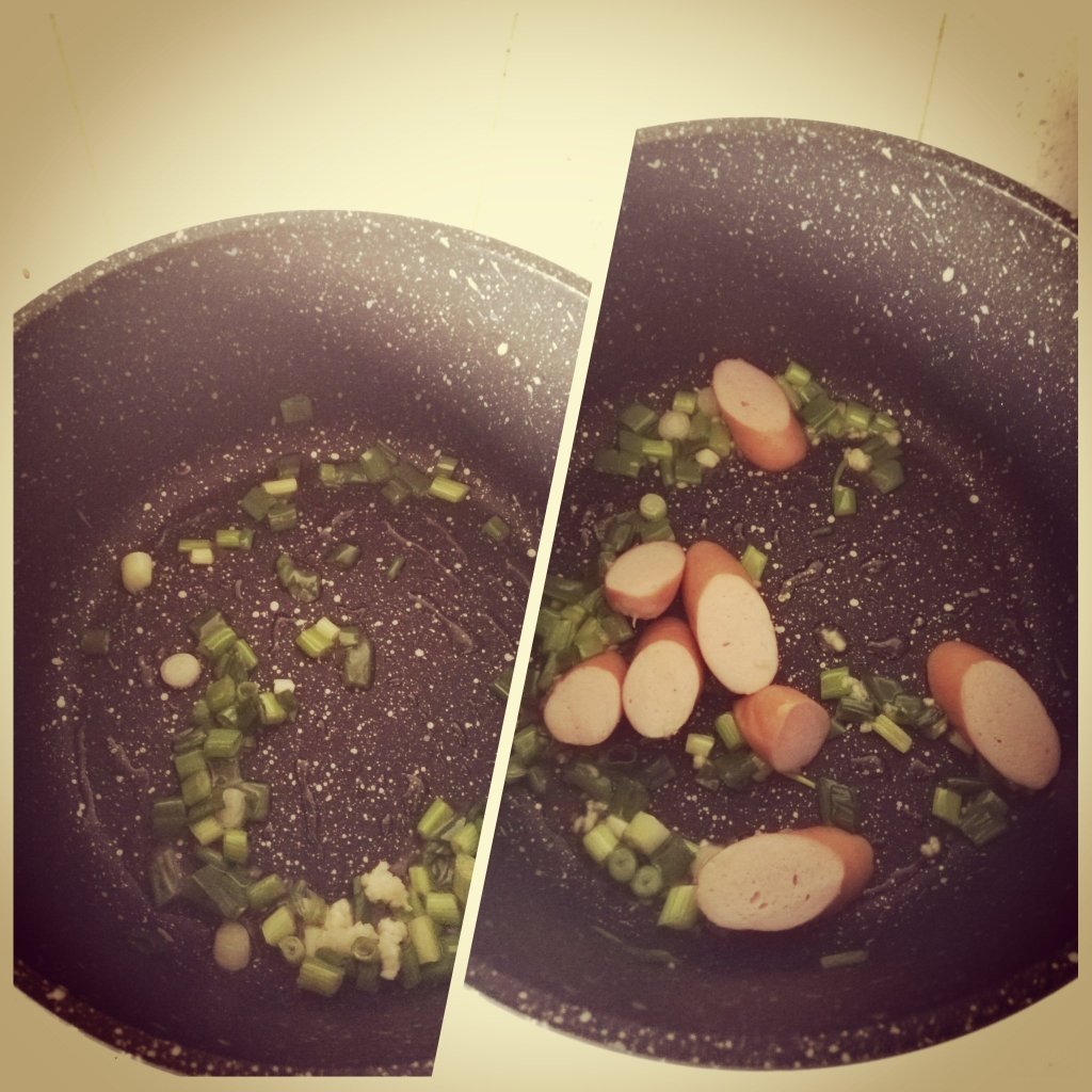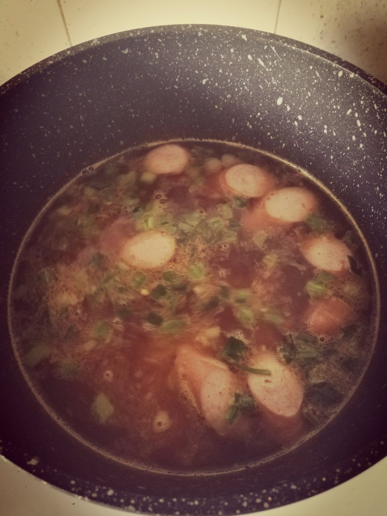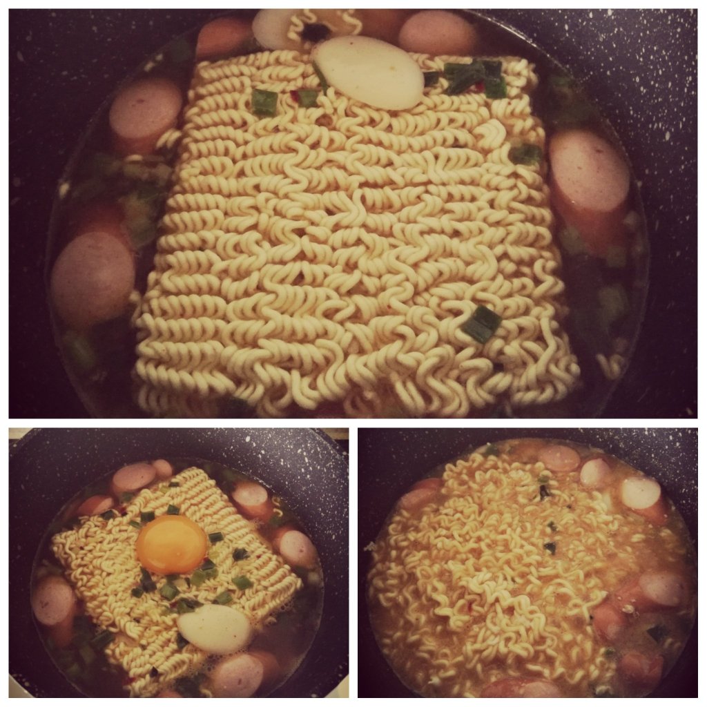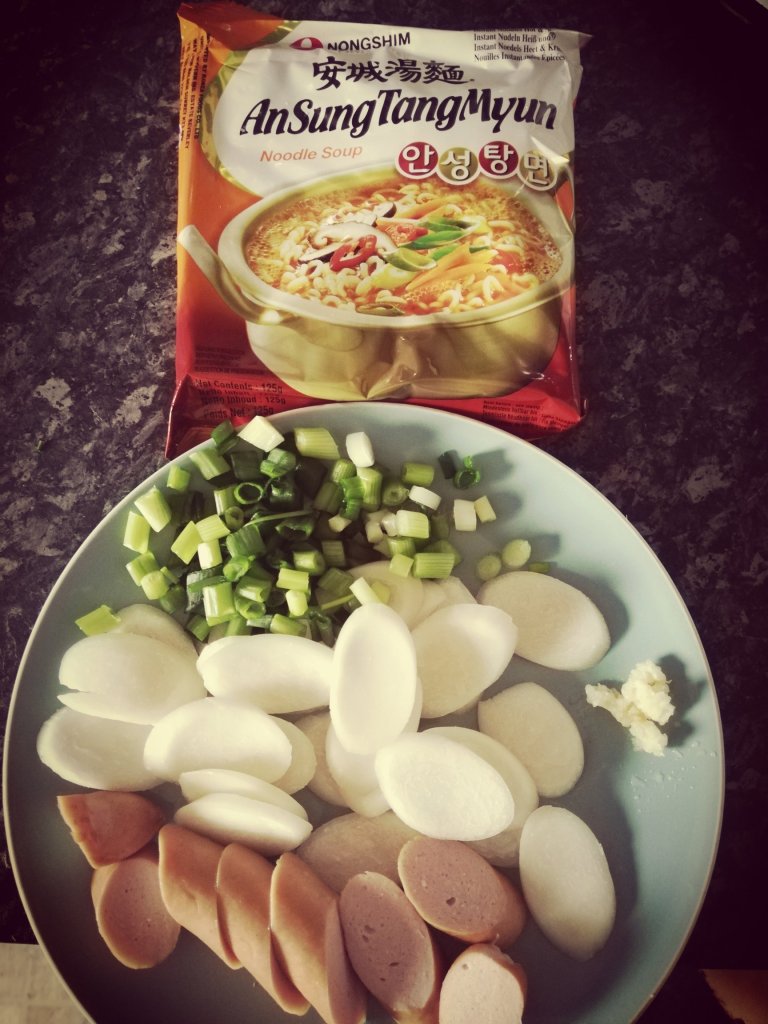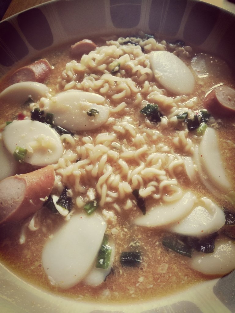 Ingredients: your choice of instant noodles, spring onions (finely chopped), 1 garlic clove (crushed), Korean rice cakes and 1 frankfurterAdd oil to a pan and add the spring onions and the garlic. Fry them off until fragant and then add the frankfurter Pour in boiling water and add the rice cakes and the seasoning packet from the instant noodles. Give it a stir and let it simmer until the rice cakes are cookedAdd your instant noodle and then if you want you can add an egg and stir it through. The egg just thickens the soup a little bitDinner is ready!