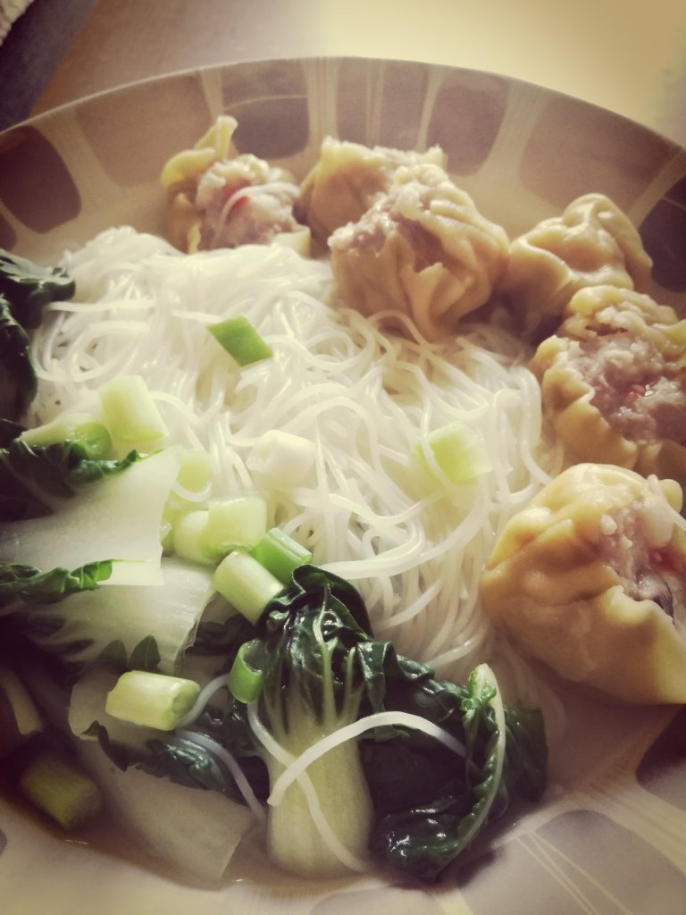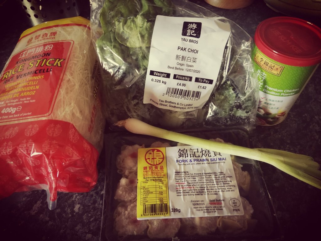 Ingredients: vermicelli noodles, pak choi, chicken stock powder, pack of frozen siu mai and spring onionPut the stock powder and boiling water into a pan, put a lid on and let it boilAdd your noodles and the siu mai and let it cookOnce the siu mai and noodles are cooked, add your pak choi, put a lid on and let that boil a little more until the pak choi is cookedOnce cooked, add your spring onions at the endFor the dipping sauce, I put black rice vinegar and chilli oil and mix. It has a good vinegary and chilli kick for the siu mai! Lunch is ready!