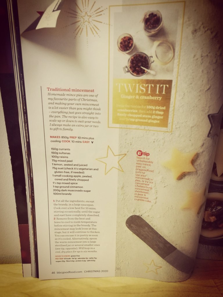 Now, I’m never into mince pies but my other half loves them so I thought I would make mince pies for him. I had to look for a mince pie filling recipe and luckily BBC Good Food magazine came to the rescue!